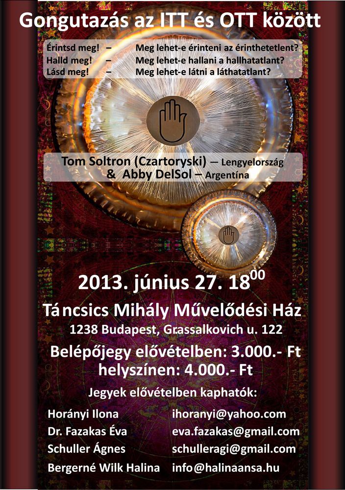 A Nemzetközi Gong Tábor keretében gong, rezgés, ének, gongjóga foglalkozások Tom Soltron és Abby Del Sol valamint Bergerné Wilk Halina és Dr. Fazakas Éva közreműködésével.